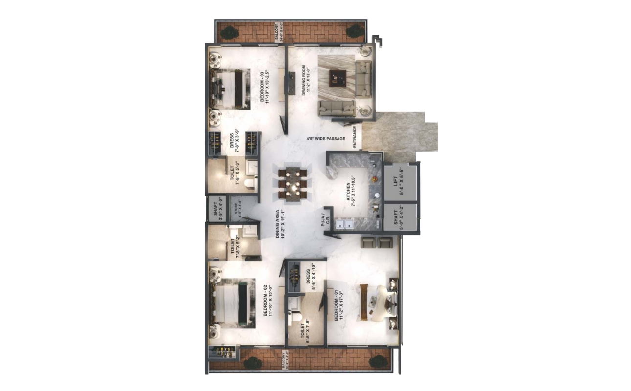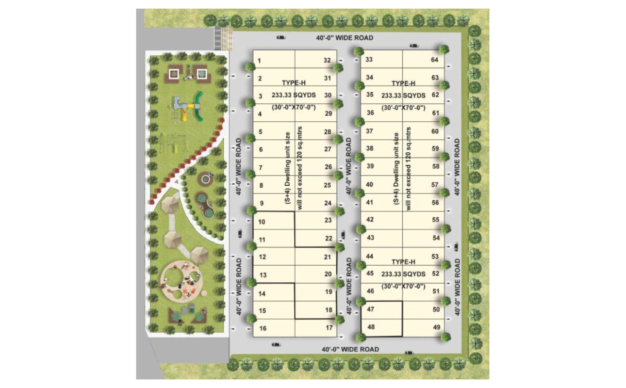 | Structure | 4 Storied, Earthquake Resistant Aluminium Formwork System (Mivan, Malaysian Technology) RCC framed structure, Bricks only where needed. |
